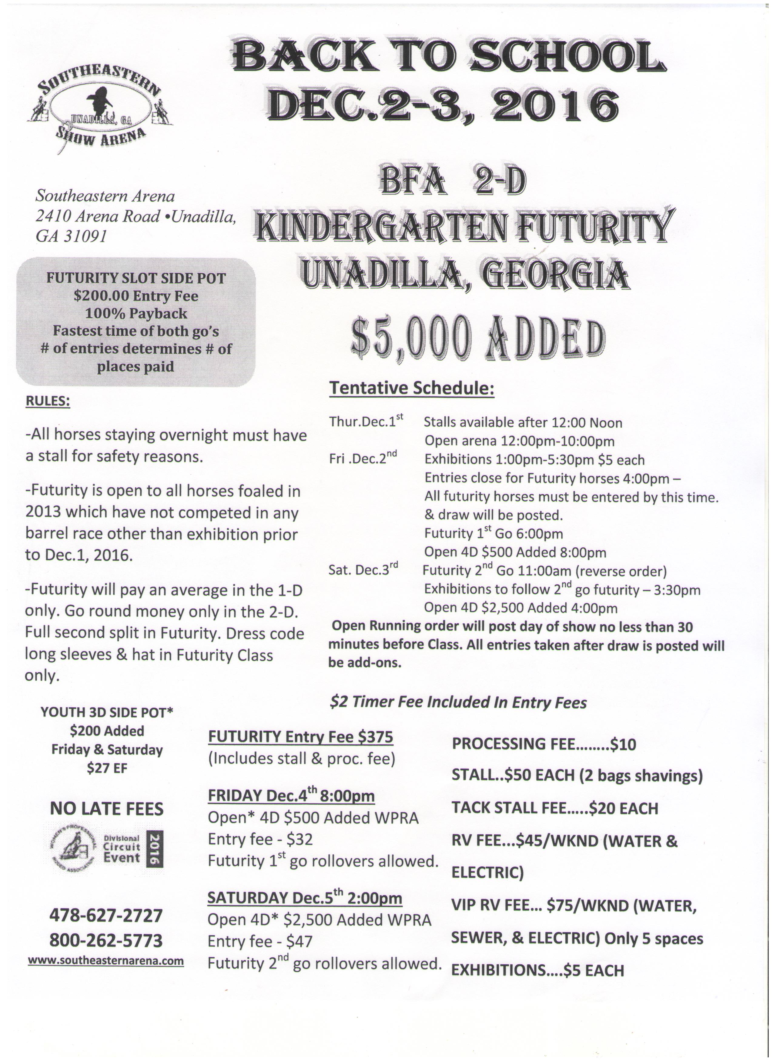 | DECEMBER 2-3 | Kindergarten 2D Futurity & Open Show } Event Flyer } Results: Youth 3D: Friday + Saturday } Results: Open 4D: Friday + Saturday } Results: Kindergarten-Futurity |